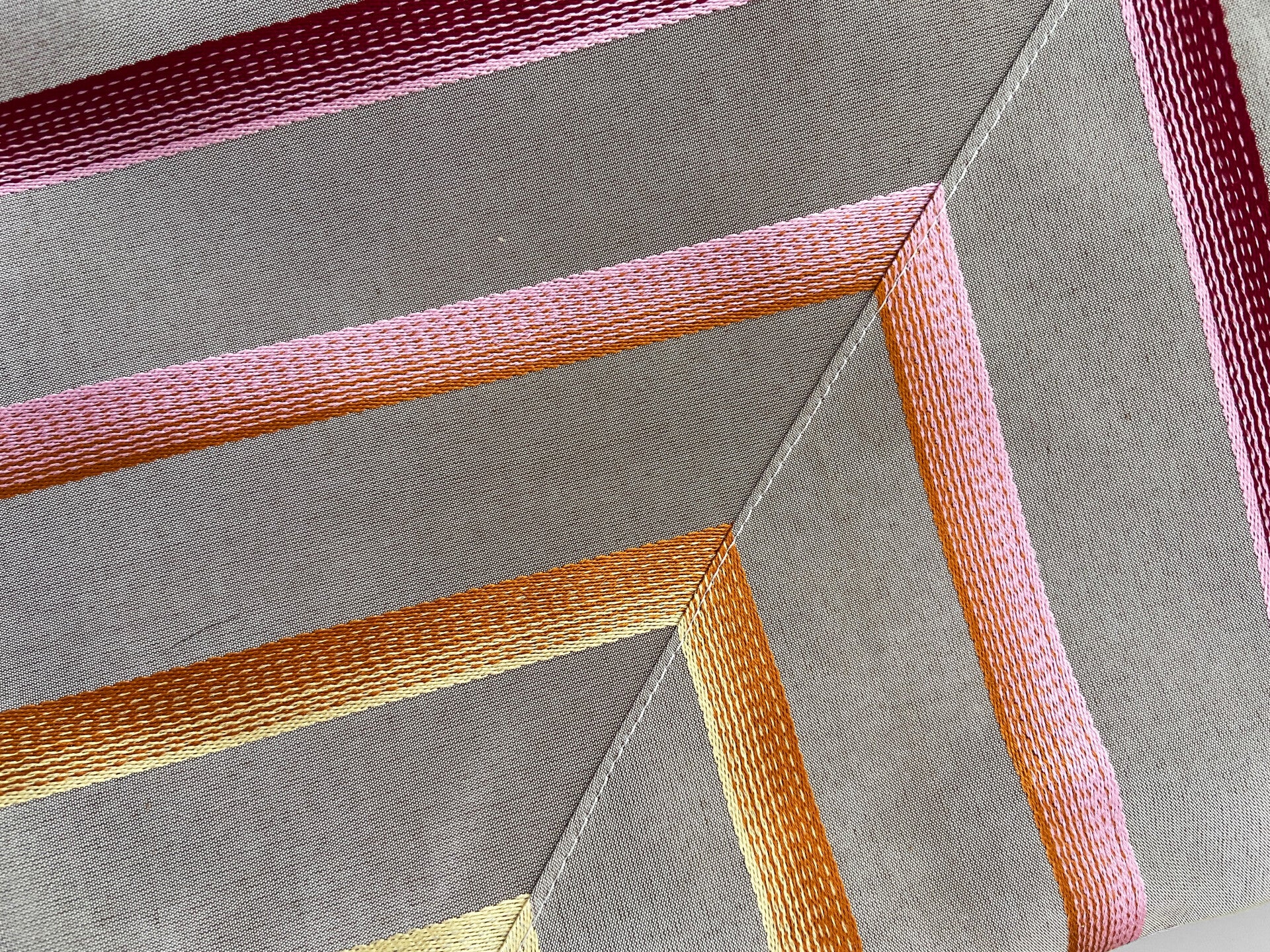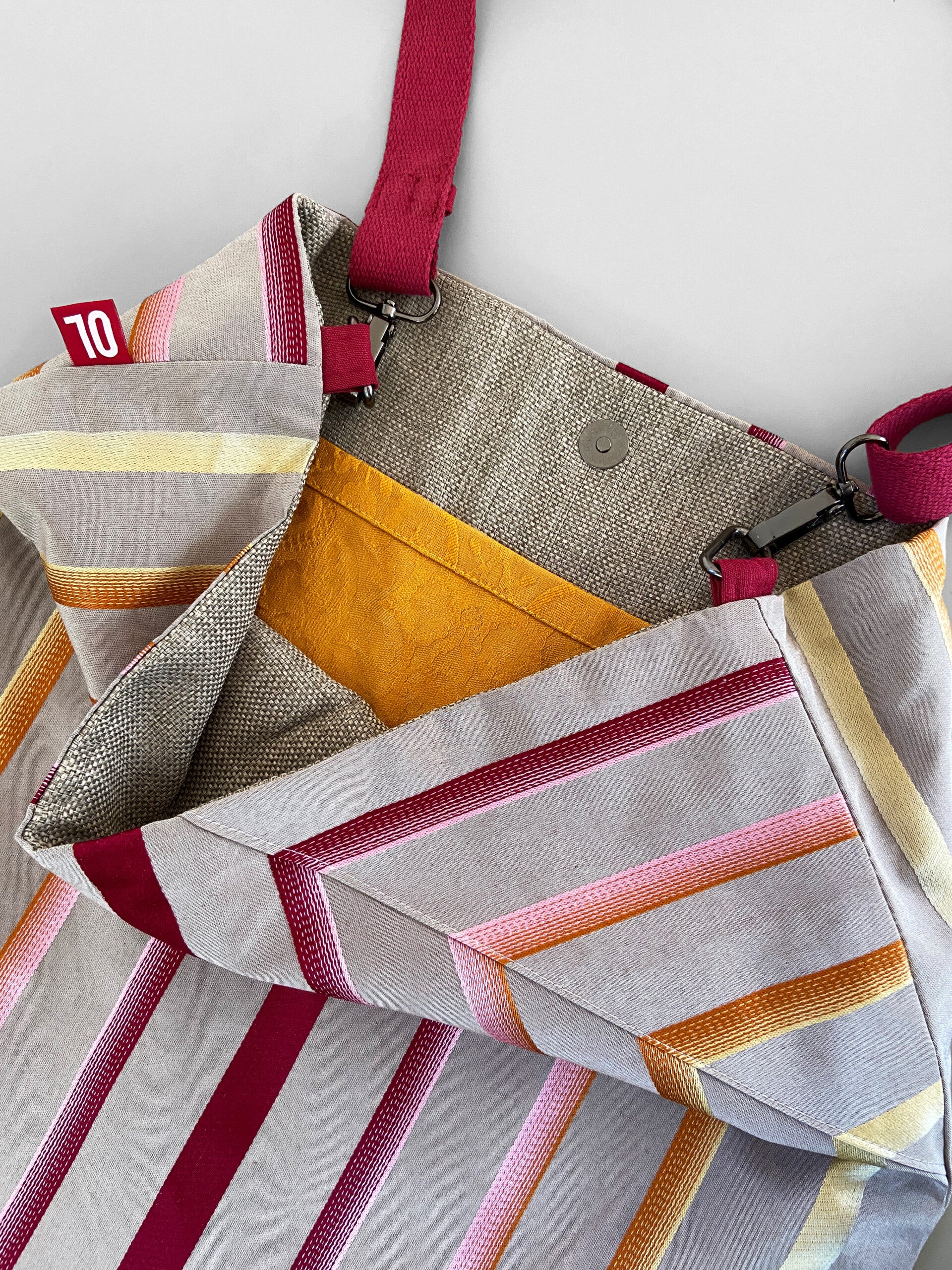 Kombinované materiály, vnitřní kapsy, textilní popruh.Vyšívané pruhy.