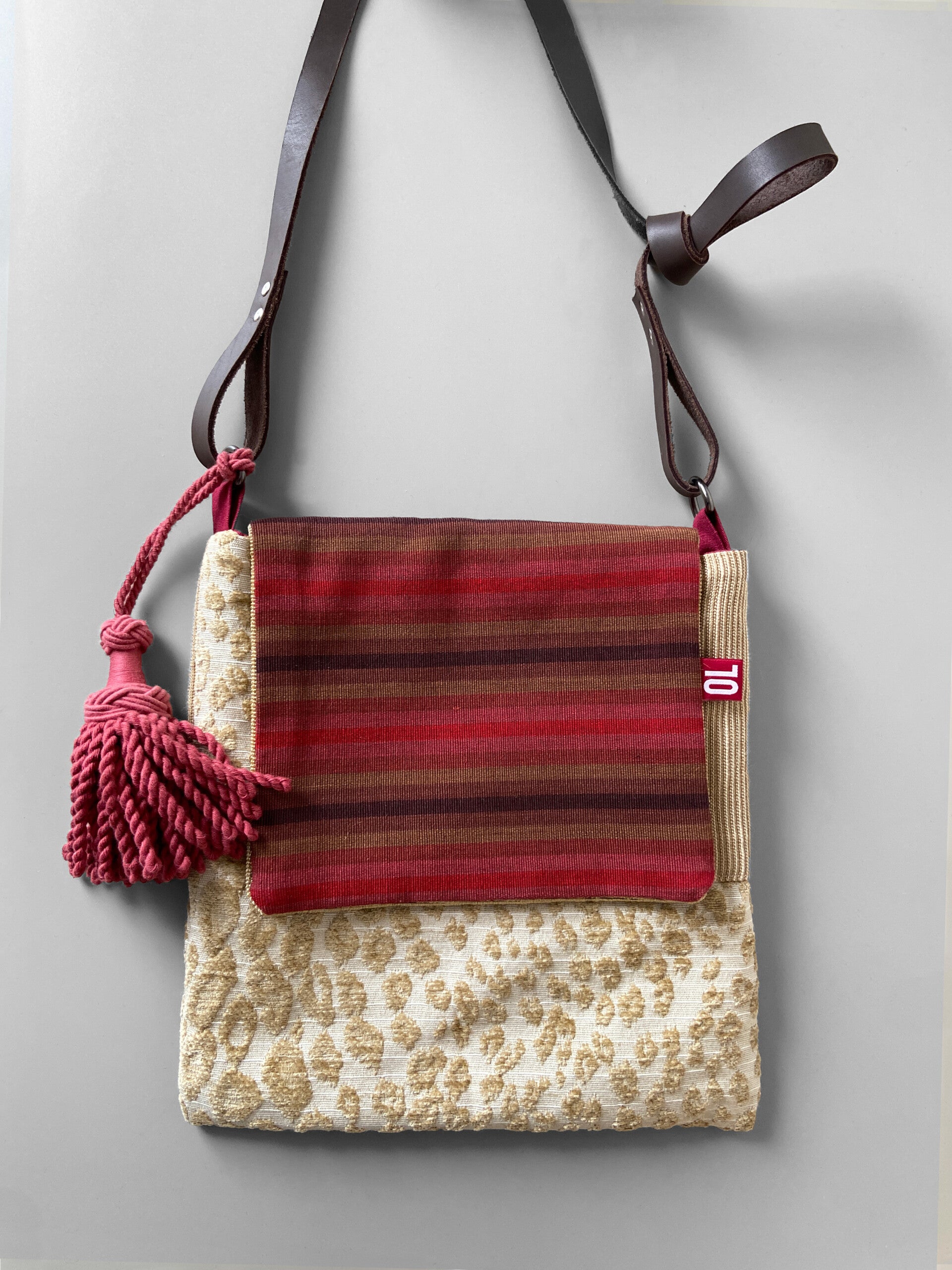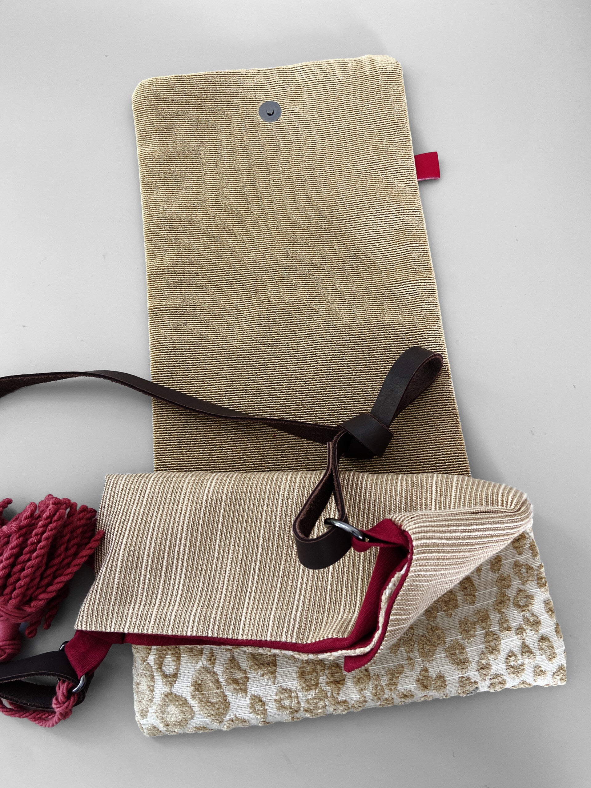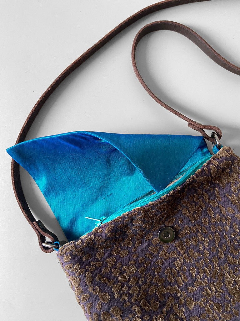 Kombinované materiály, vnitřní kapsy, kožený popruh. Samet se vzorem, brokáty, plátno.