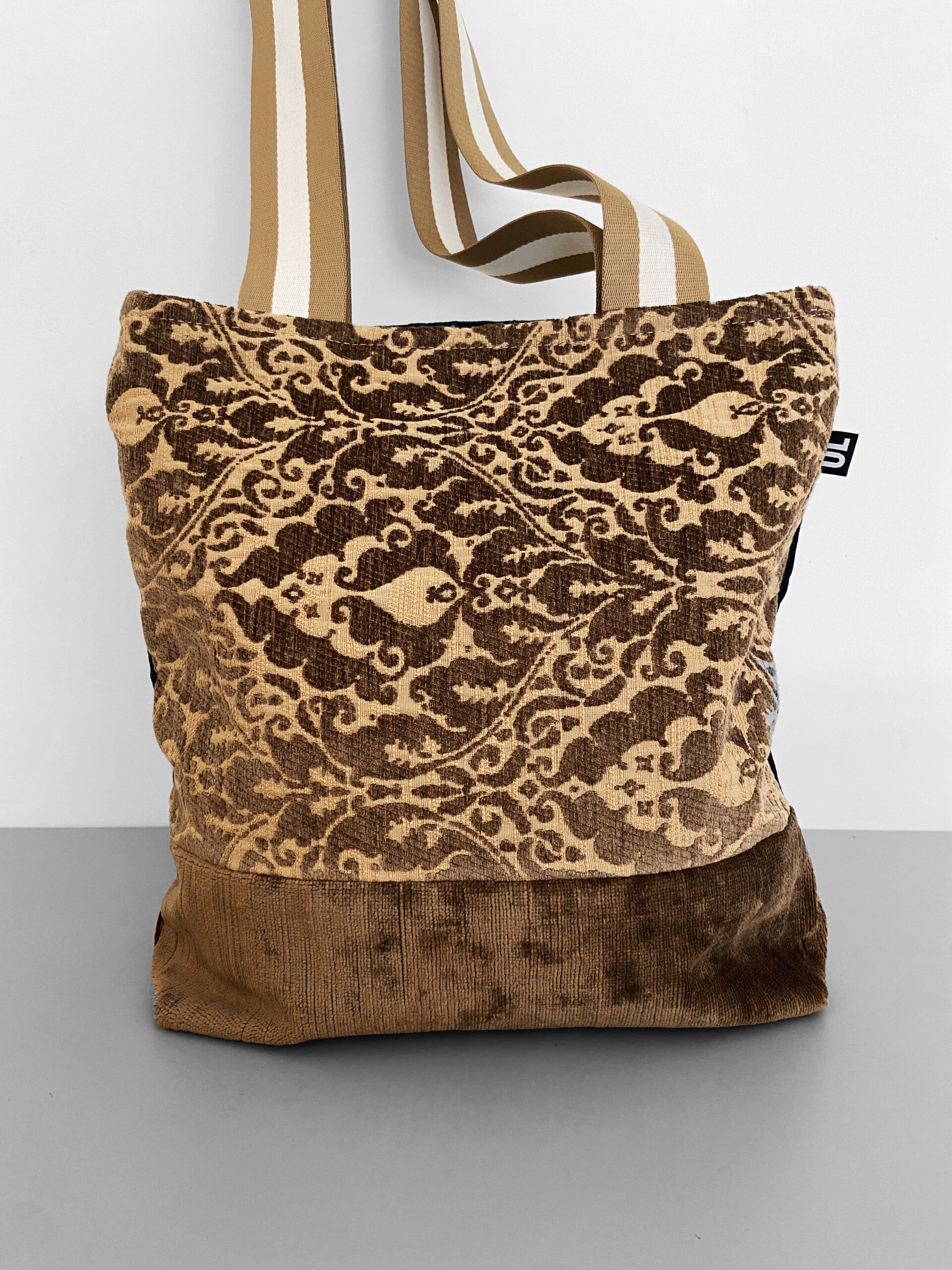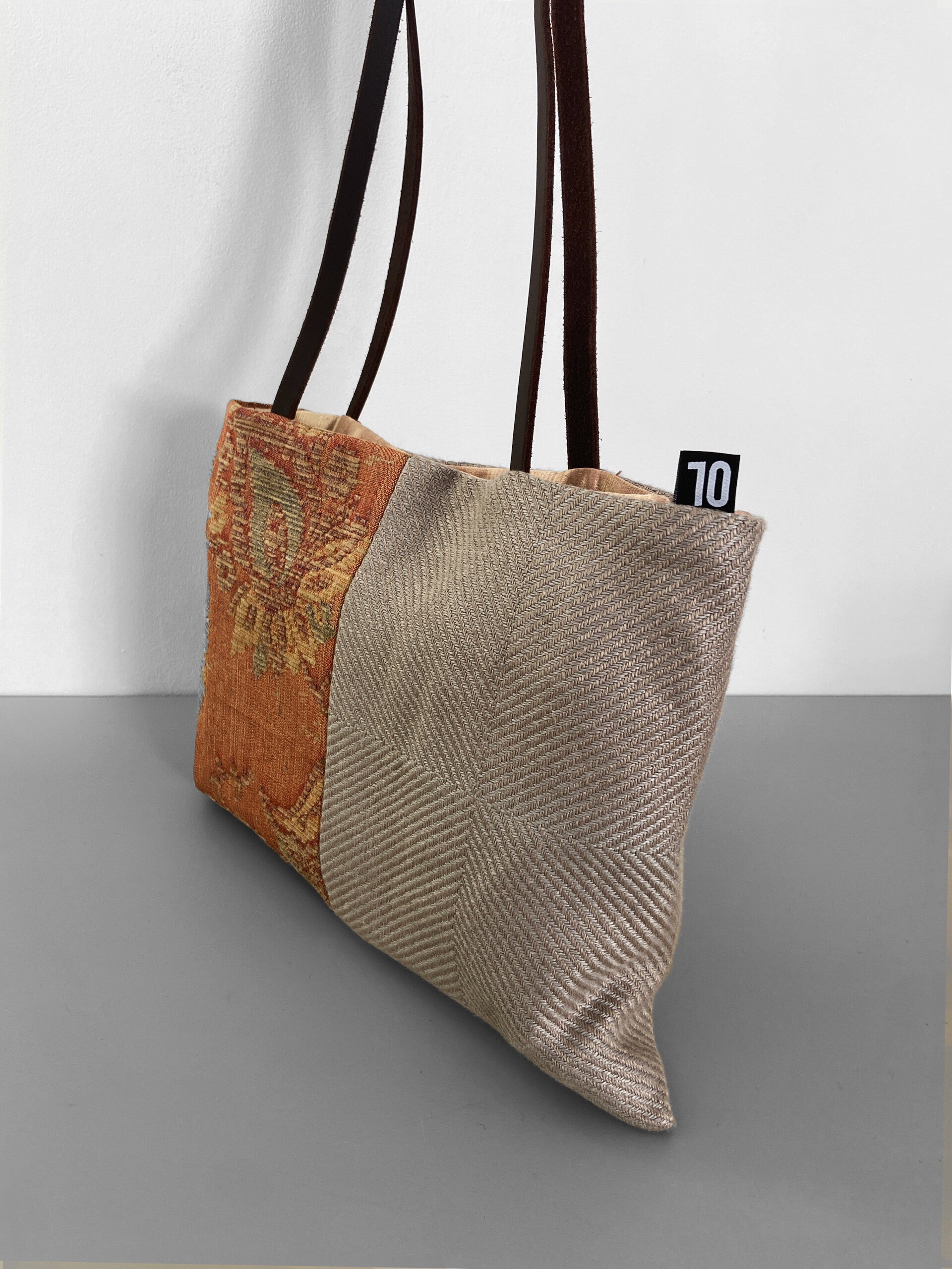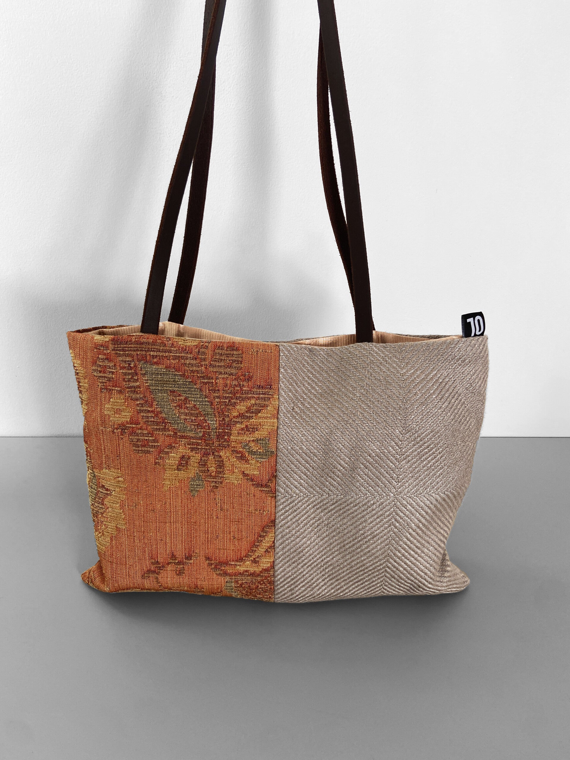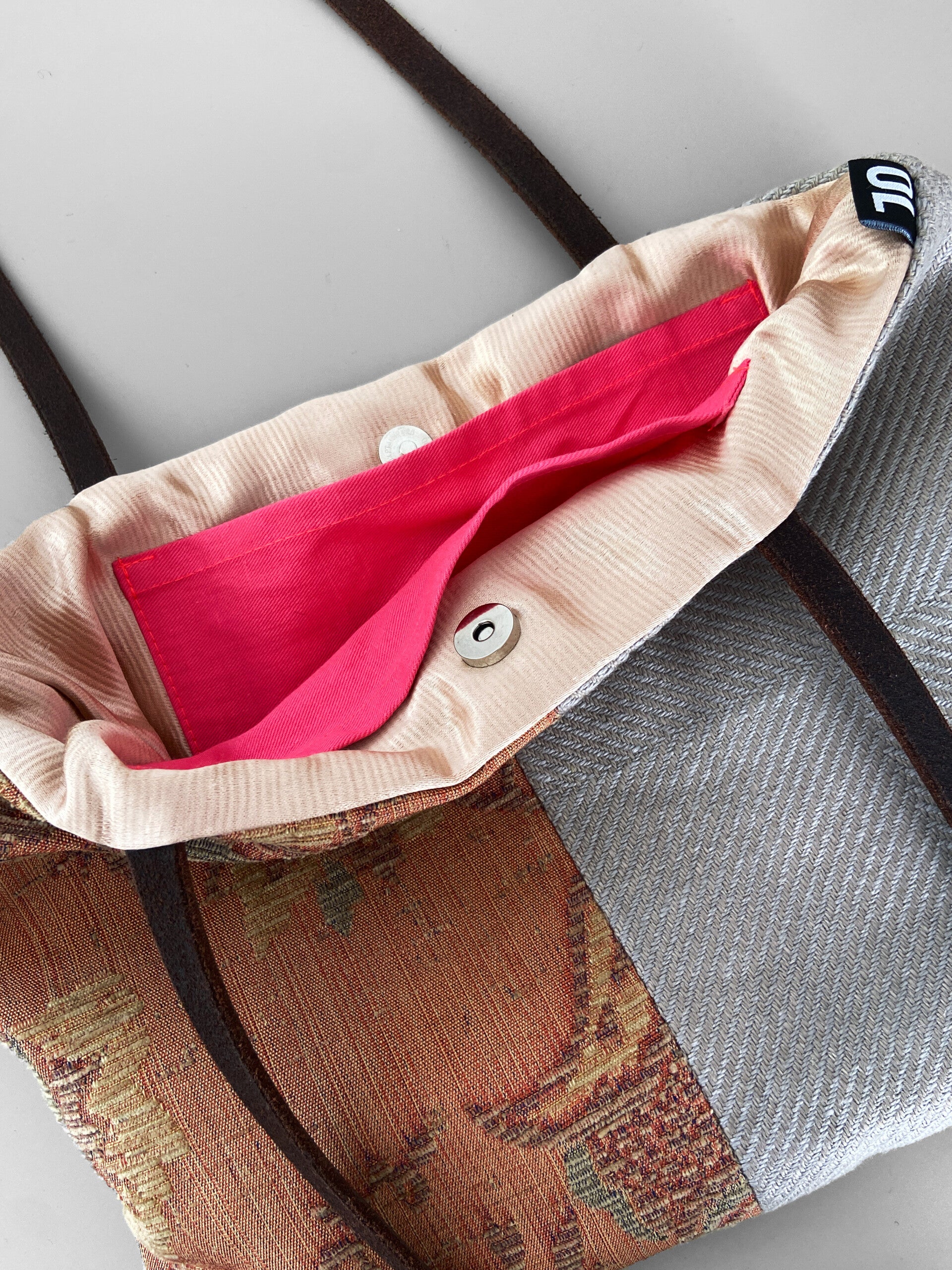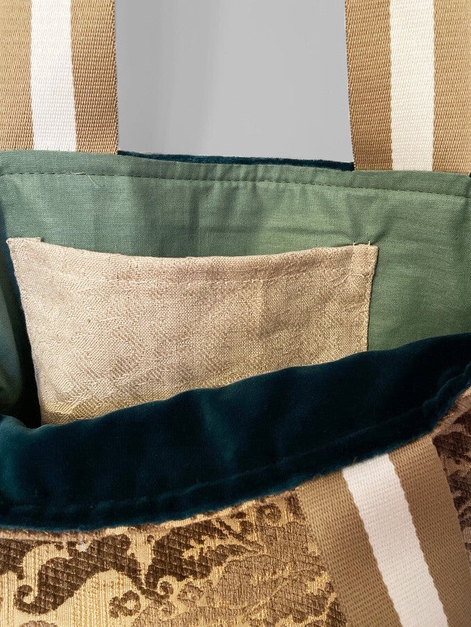Kombinované materiály, vnitřní kapsy, textilní popruh. Samet, čalounická látka se vzory, satén.
