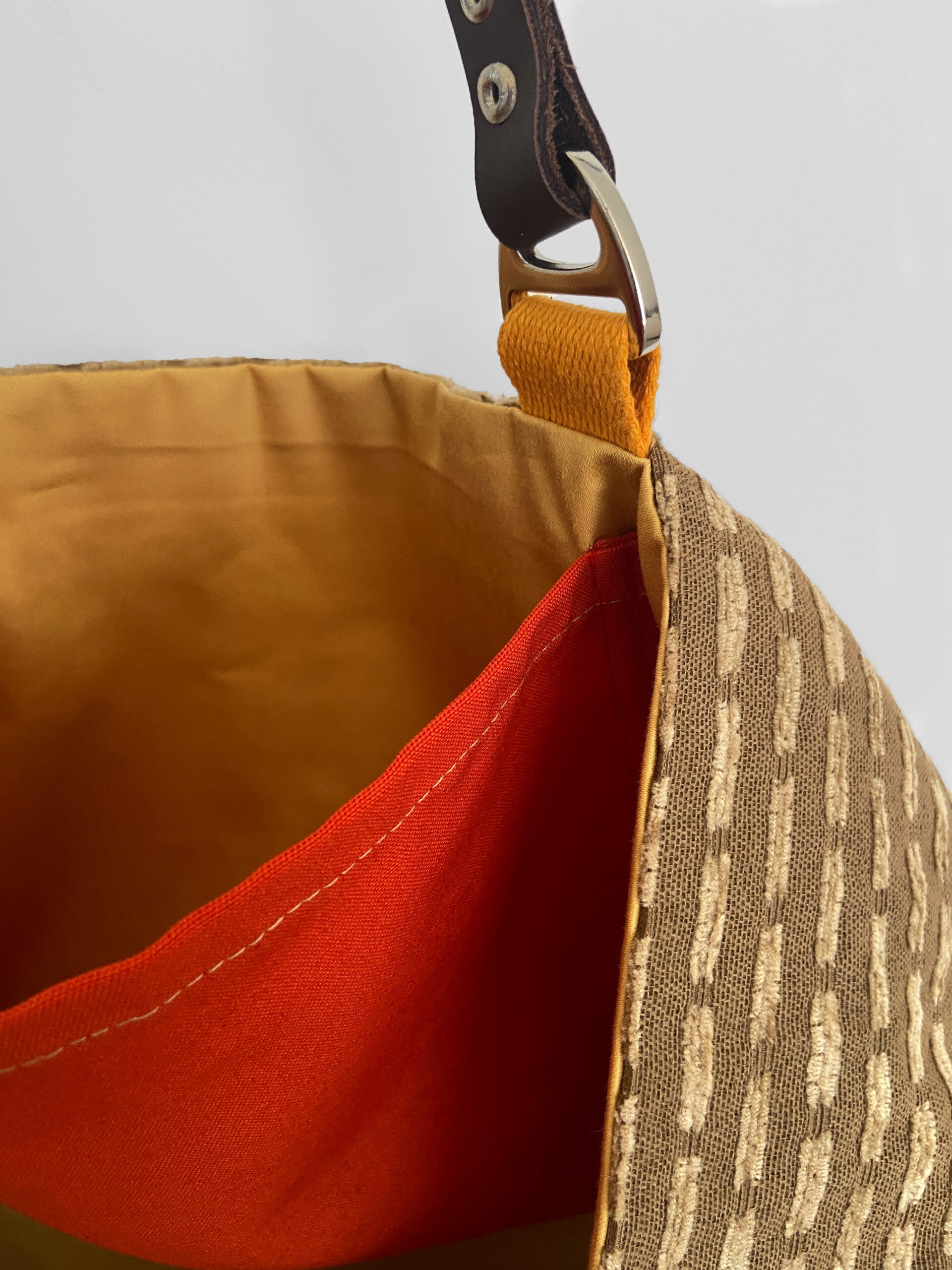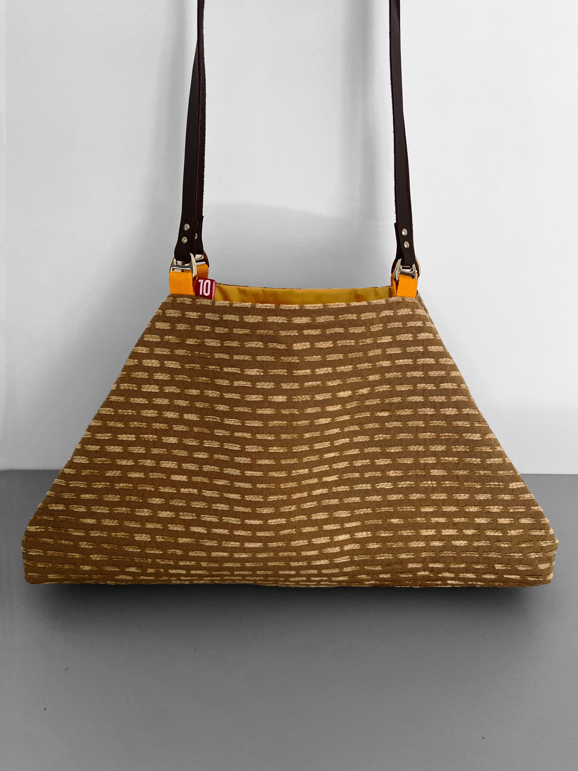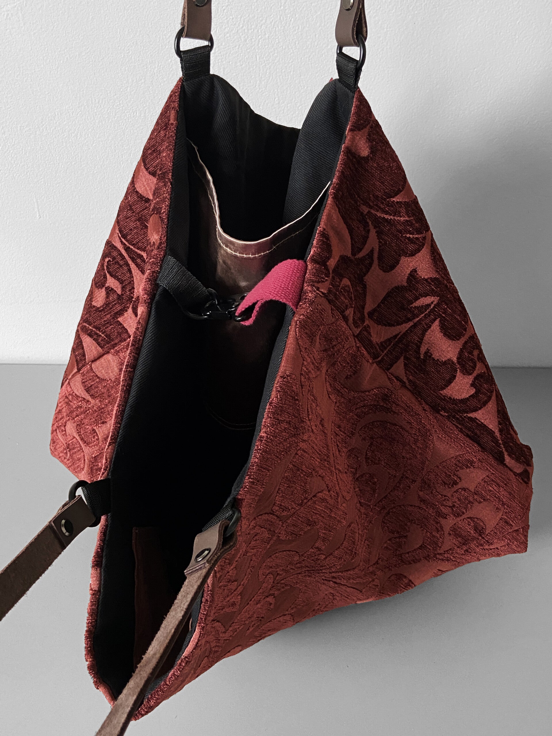 Kombinované materiály, vnitřní kapsy, kožený popruh. Čalounický samet, satén, len.