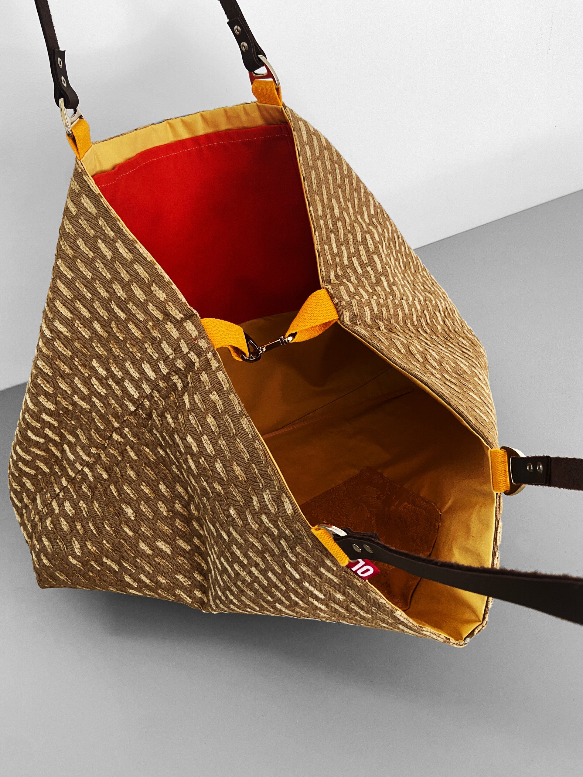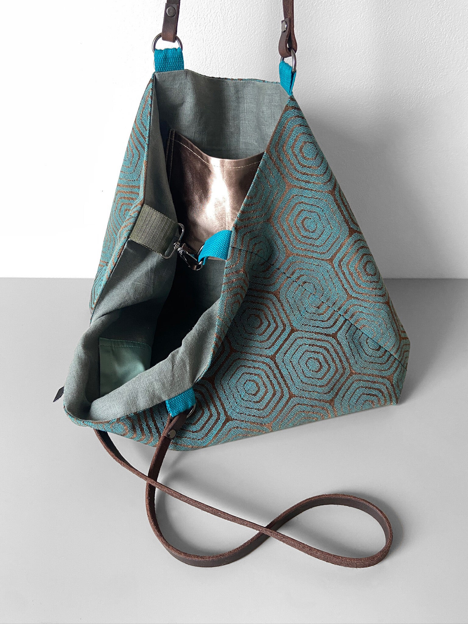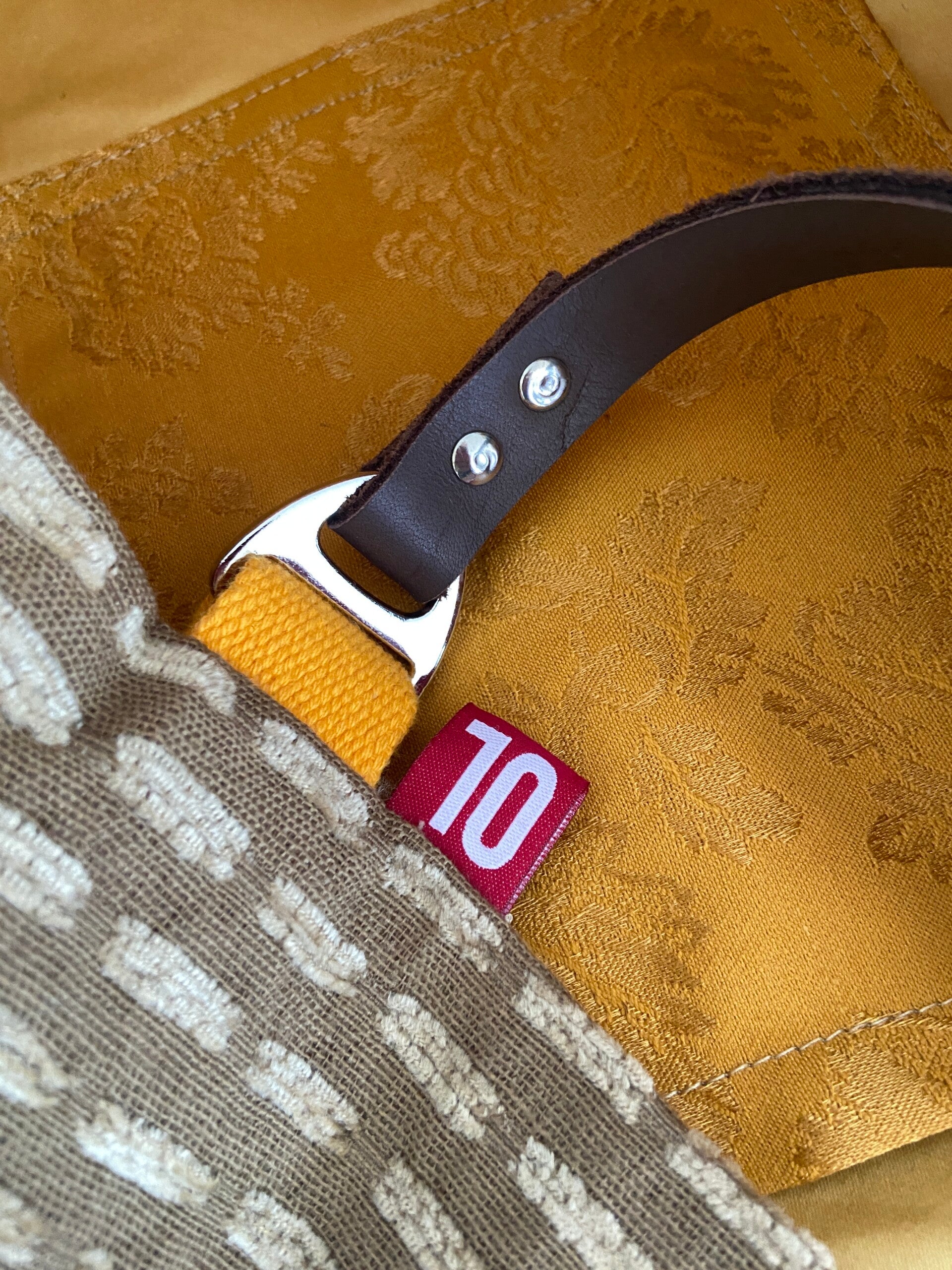 Kombinované materiály, vnitřní kapsy, kožený popruh. Čalounický samet, satén, len.